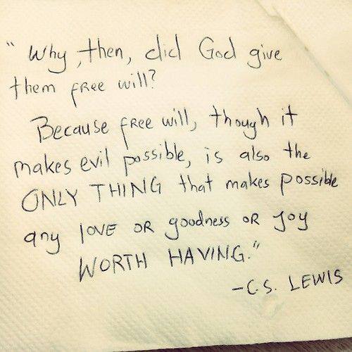 “Zašto im je onda Bog dao slobodnu volju? Zato što je slobodna volja, iako ostavlja mogućnost zlu, ujedno jedina stvar koja omogućava ljubav, dobro ili radost koje vrijedi imati.”  – C.S.Lewis