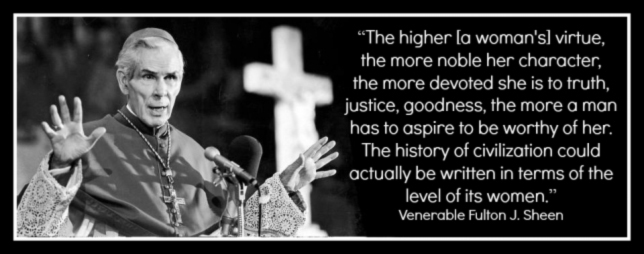 Biskup Fulton J. Sheen imao je jasan uvid kada je izjavio da je razina  civilizacije svakog društva uvijek određena ženama. Ako žene odbiju sudjelovati u predbračnom seksu i inzistiraju da se muškarci prema njima odnose na dobar način prije braka i u samom braku, one će uzdići razinu na kojoj se nalazi cijela kultura.”