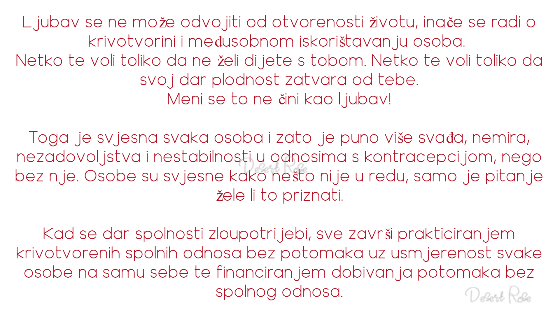 “Bez istine, ljubav se srozava na sentimentalizam. Ljubav postaje prazna ljuska koju proizvoljno treba napuniti. U tome je kobna opasnost ljubavi u kulturi bez istine. Ona je plijen slučajnih emocija i mišljenja subjekata, zlorabljena i iskrivljena riječ do te mjere da znači suprotno.”